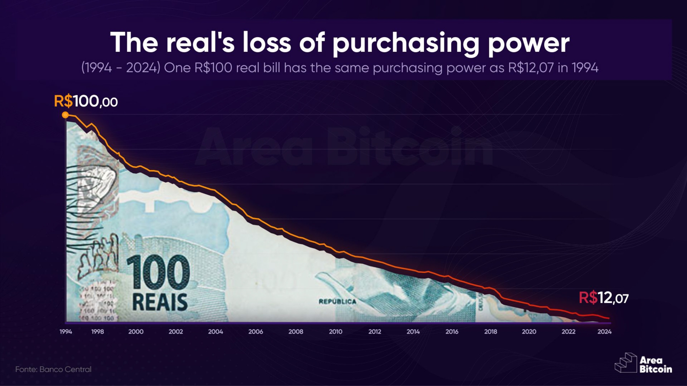For an even faster example of this loss of value, we can consider the real, the Brazilian currency. It has lost 87% of its purchasing power since it was created in 1994, after decades of suffering from hyperinflation, confiscation of savings and recurrent economic crises. Today, almost 30 years later, the purchasing power of 100 reais has the same purchasing power as 12 reais in 1994. It melted a lot and in less time than the dollar!