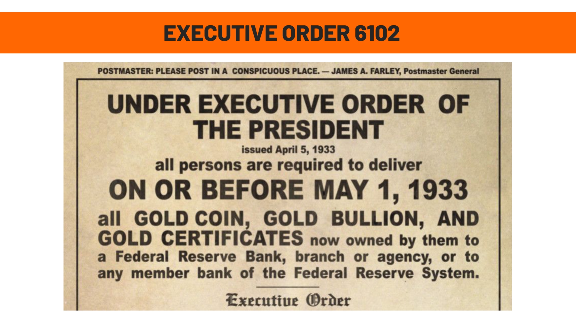 In 1933, the US government confiscated the population's gold in a kind of "regulated theft". Through Executive Order 6102, it was decreed that all citizens had to hand over their gold to the Federal Reserve. This measure obliged people to hand over their wealth to the government, under penalty of legal sanctions. That was a massive confiscation.