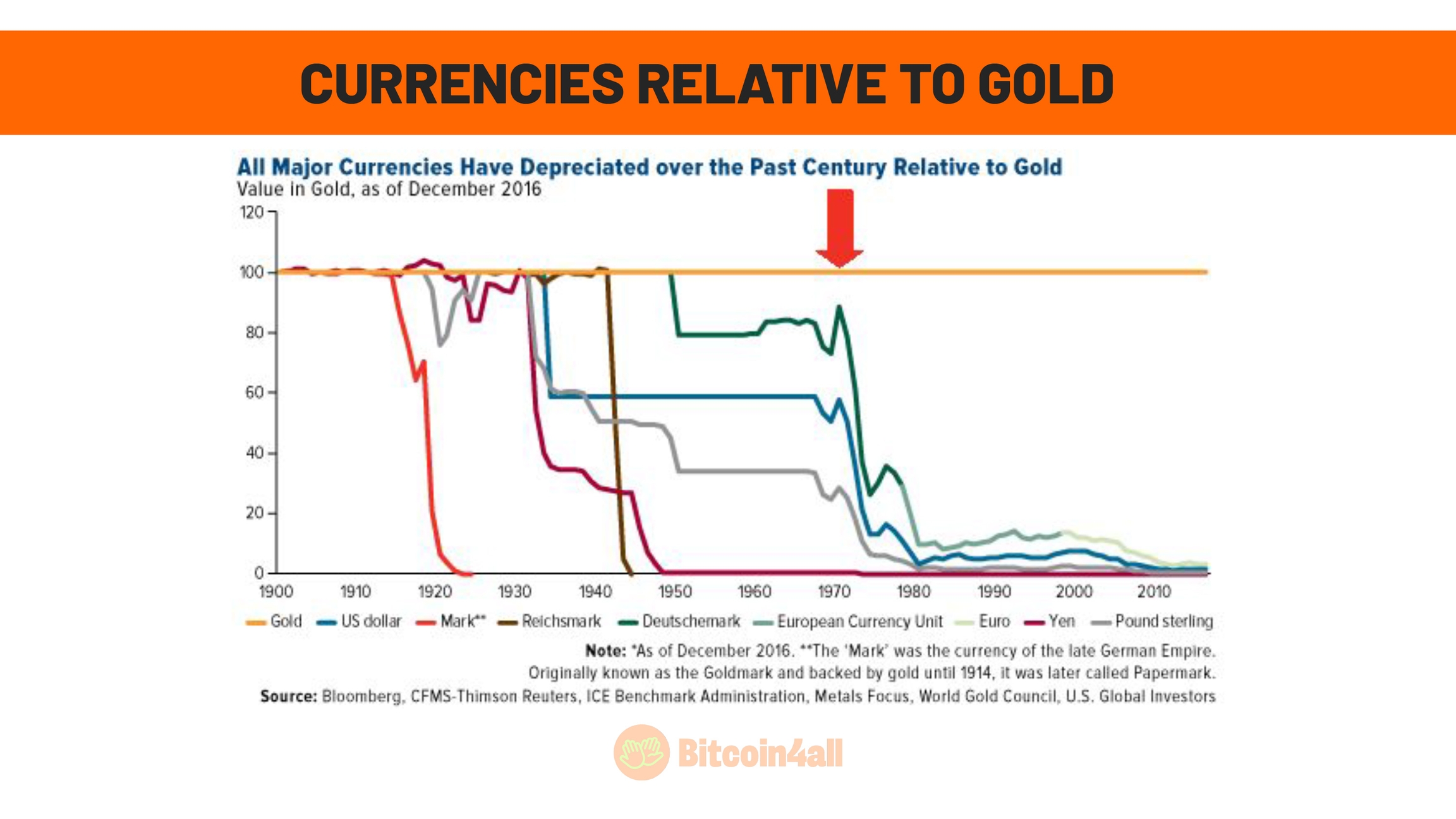 If you compare the performance of government-issued currencies with gold over time, you'll see that they all lose value against it. In this graph, the yellow line represents the value of gold, while other colored lines show the main global currencies, such as the dollar (in blue), the German mark merging with the euro (in shades of green), and the pound sterling (in gray). The standard is clear: gold retains its value, while fiat currencies lose it.