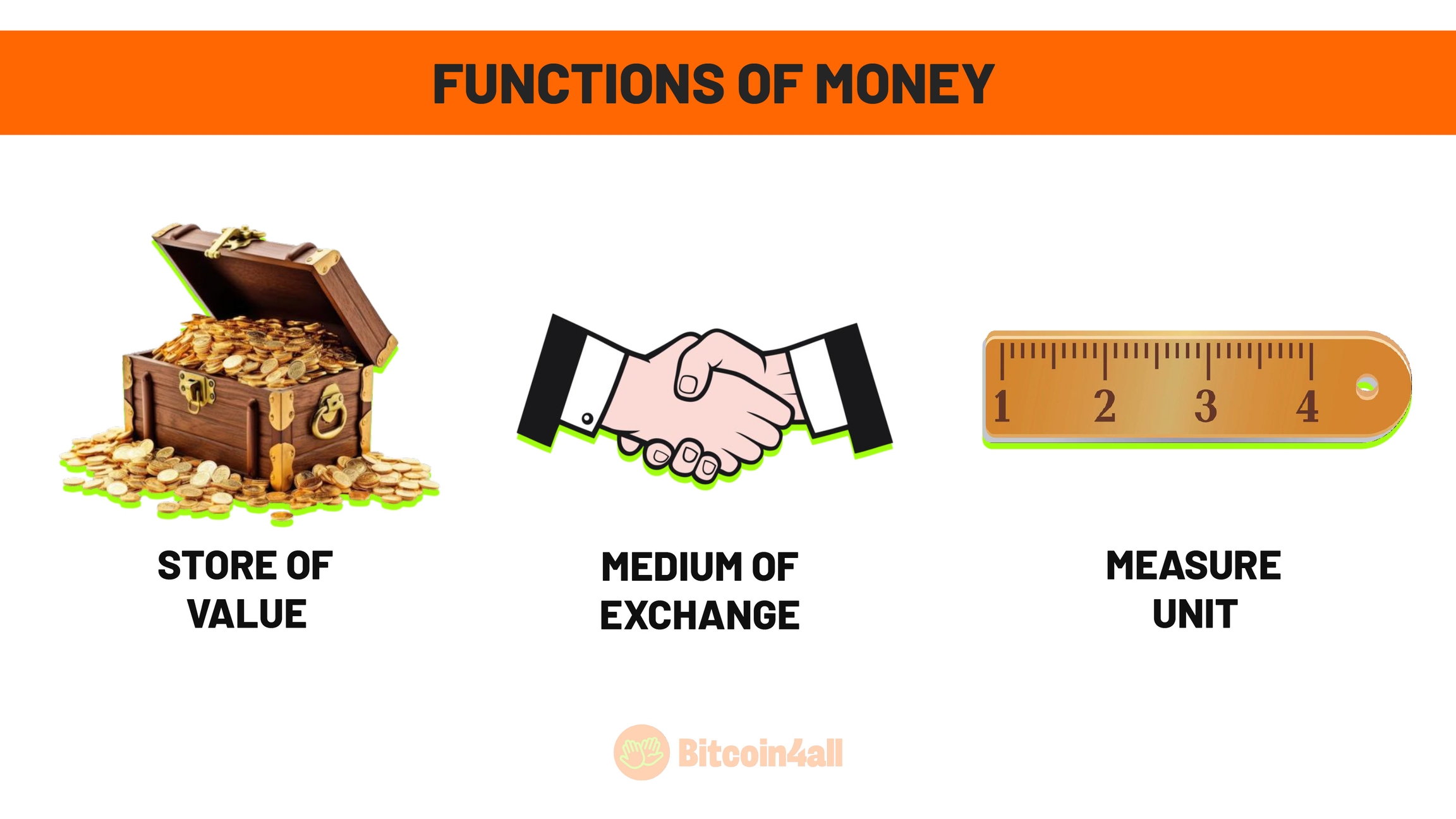 So gold became the most widely used money in history; upon becoming money, it took on 3 functions: